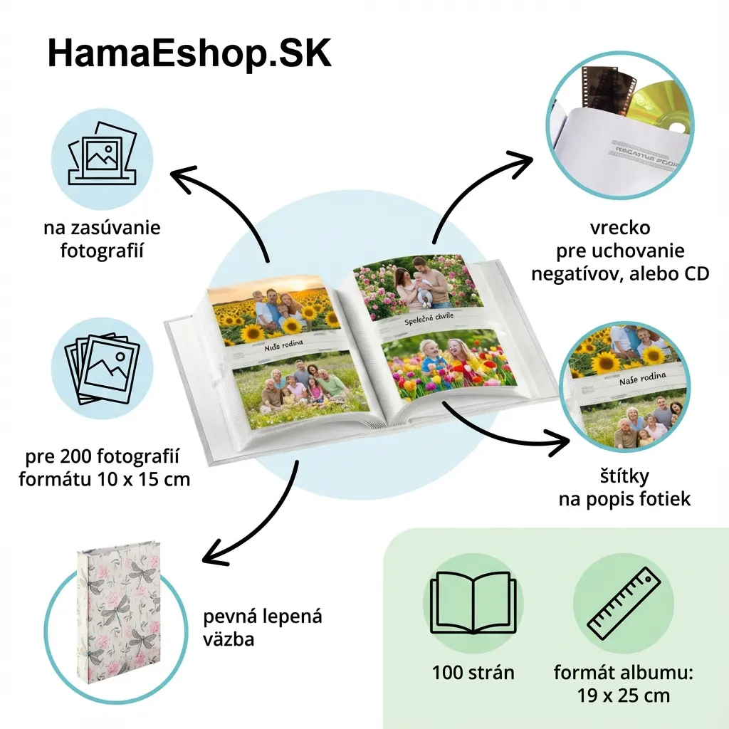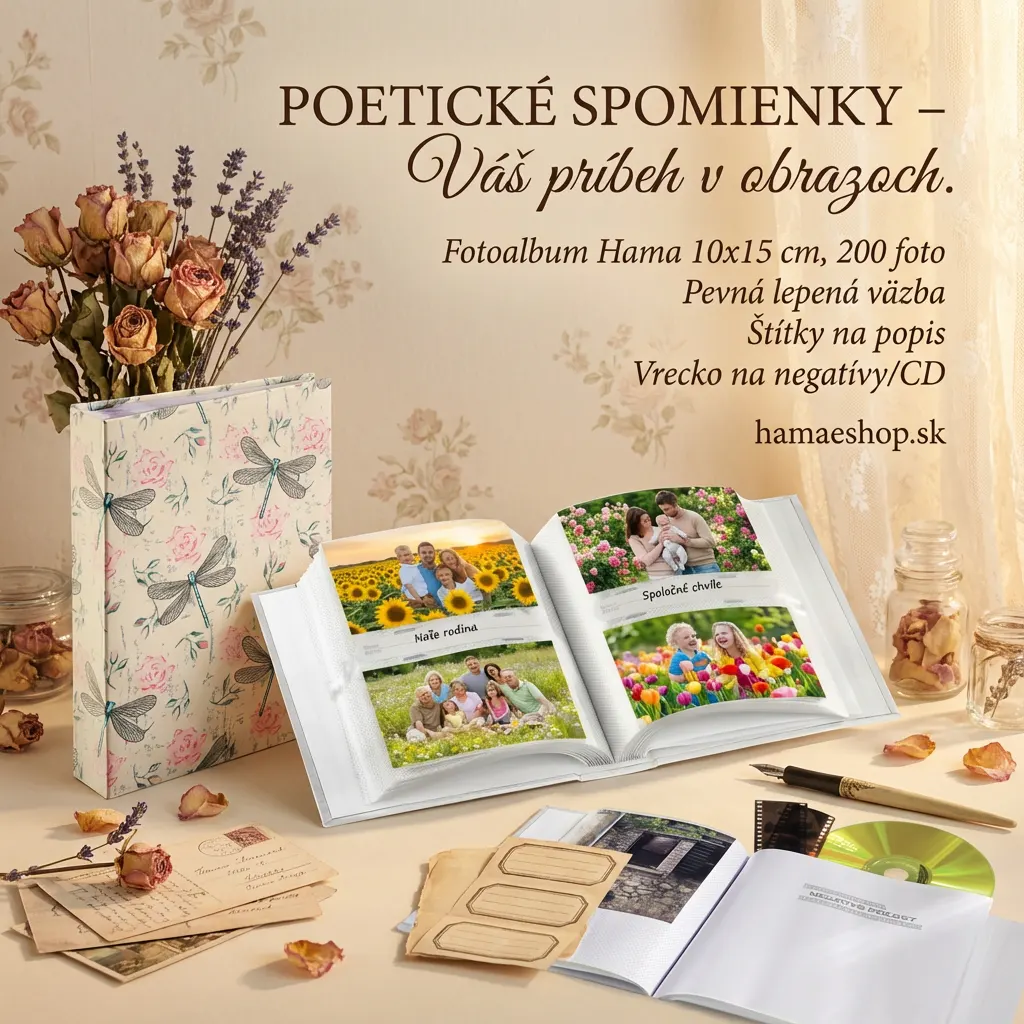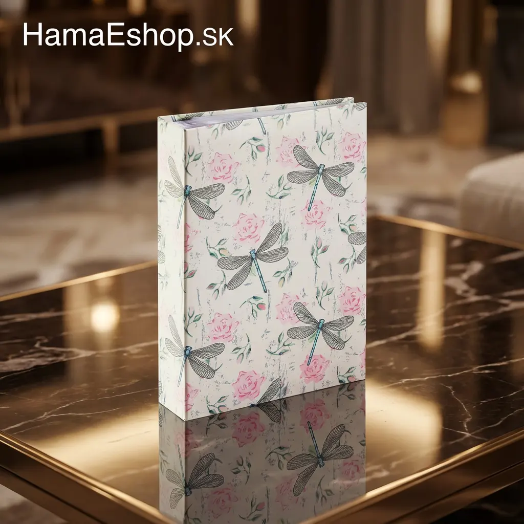 Fotoalbum Hama Poetic je romantický a poetický album s jemným vintage botanickým dizajnom kombinujúcim detailné ilustrácie vážok a ruží na krémovom pozadí. Celá plocha obalu má jemné krémové (slonová kosť, ecru, béžové) pozadie s jemnou vintage texture pripomínajúcou starý papier alebo textil s miernymi škvrnami, odtlačkami a opotrebovaným efektom typickým pre shabby chic štýl. Na tomto pozadí je opakujúci sa vzor zobrazujúci dva hlavné motívy - vážky a ruže. Vážky sú nakreslené s výrazným detailom - majú štyri veľké priesvitné krídla s jemnou čiernobielo-šedou sieťovinou žiliek pripomínajúcou skutočnú štruktúru vážích krídel, štíhle modré telo (tyrkysové, svetlomodré) s čiernymi segmentami a malú hlavu. Každá vážka je orientovaná v rôznych smeroch vytvárajúc dynamický pohyb. Ruže sú nakreslené v ružovom odtieni (blush pink, staroružová) s akvarelové štýlom - majú jemné obrysy, vrstvy lupienkov a romantický, mäkký vzhľad. Okolo ruží sú zelené listy a stonky s jednoduchými tvarmi. Medzi hlavnými motívmi sú drobné dekoratívne prvky - malé zelené vetvičky, listy, drobné ružové kvety a jemné šedé odtlačky textu alebo písmen pripomínajúce starý rukopis alebo typografiu. Celý dizajn je jemný, romantický a poetický - evokuje starú botanickú ilustráciu, vintage pohľadnice alebo shabby chic štýl. Farebná paleta krémovej, ružovej, modrej, zelenej, šedej a čiernej je harmonická, nežná a elegantná. Album pojme 200 fotografií vo formáte 10x15 cm na 100 stranách, má praktické štítky na popis fotiek a vrecko na uchovanie CD alebo negatívov. FSC certifikovaný papier zabezpečuje udržateľný pôvod.