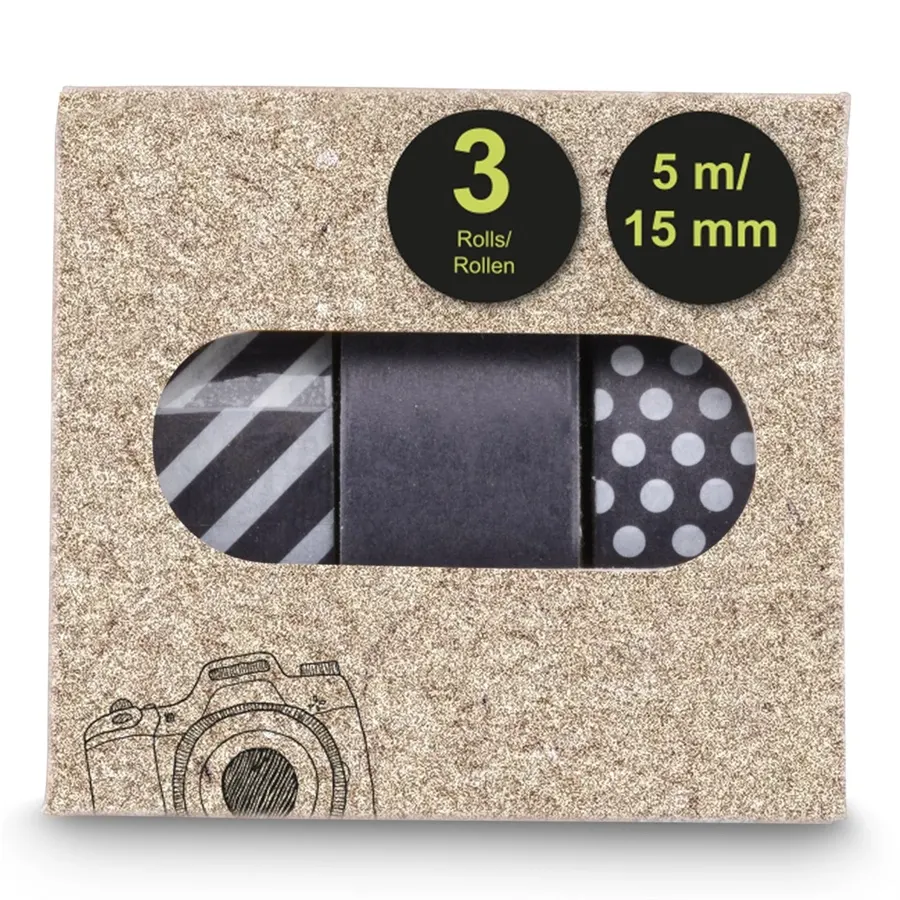 Tretia sada dekoračných pások Hama (washi pások) dokazuje, že čierna a biela nikdy nevyjdú z módy. Tento set je určený pre milovníkov minimalizmu, čistých línií a výrazných kontrastov. Balenie obsahuje tri univerzálne dizajny: dynamické čierno-biele pruhy, elegantnú plnú čiernu farbu a hravé biele bodky na čiernom podklade. Tieto pásky dodajú vašim projektom profesionálny a sofistikovaný vzhľad.