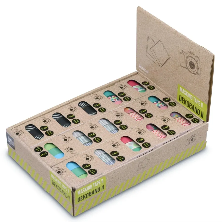 Tento produkt predstavuje kompletné obchodné balenie (predajný displej) obľúbených kreatívnych pások Hama zo série "Masking Tape II". Atraktívna kartónová krabica slúži zároveň ako prezentačný stojan, čo z nej robí ideálny produkt pre pulty papiernictiev, kreatívnych obchodov alebo pre školy a záujmové krúžky, ktoré potrebujú veľkú zásobu materiálu.