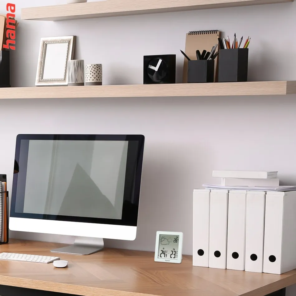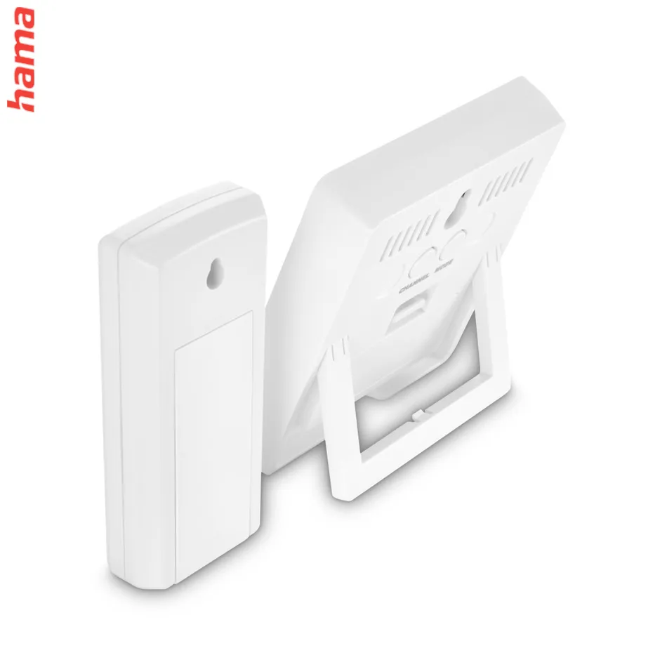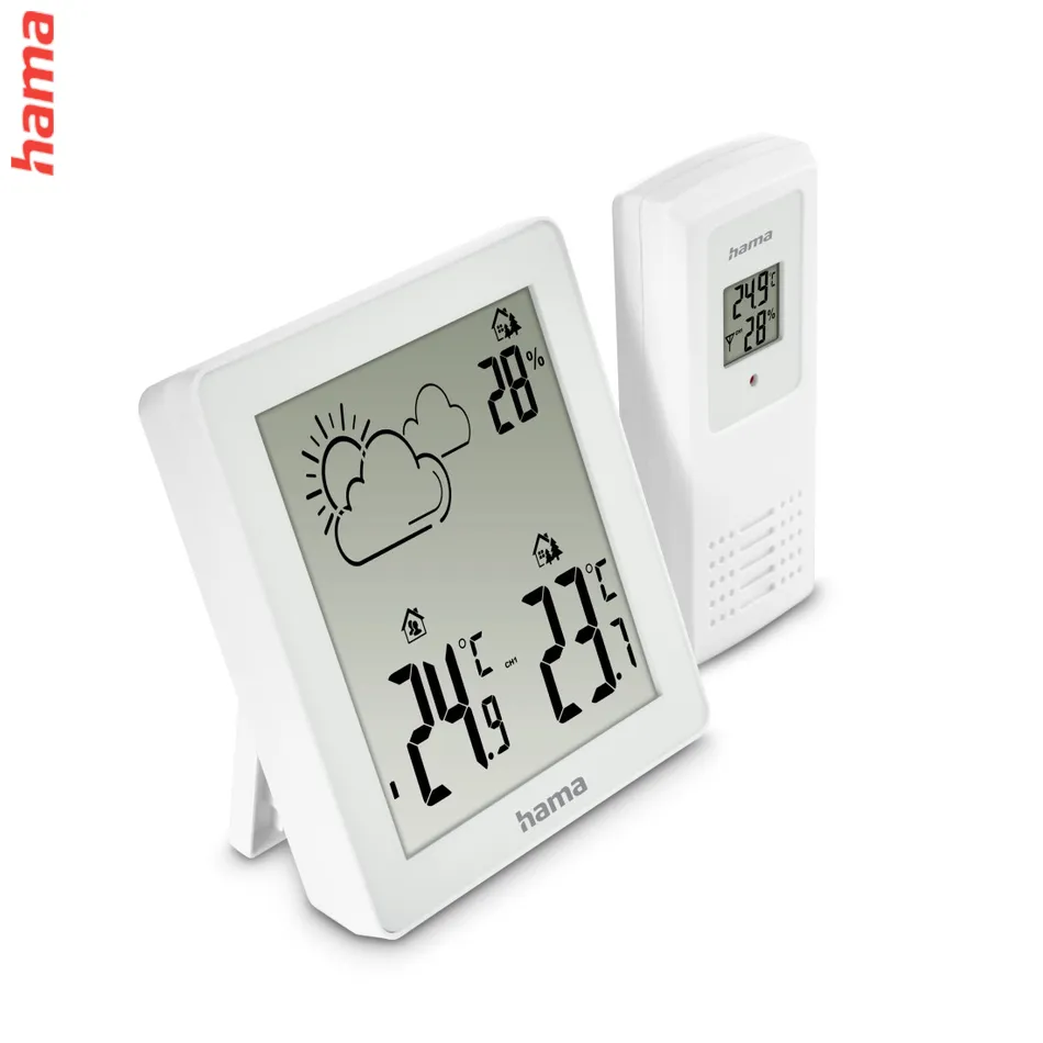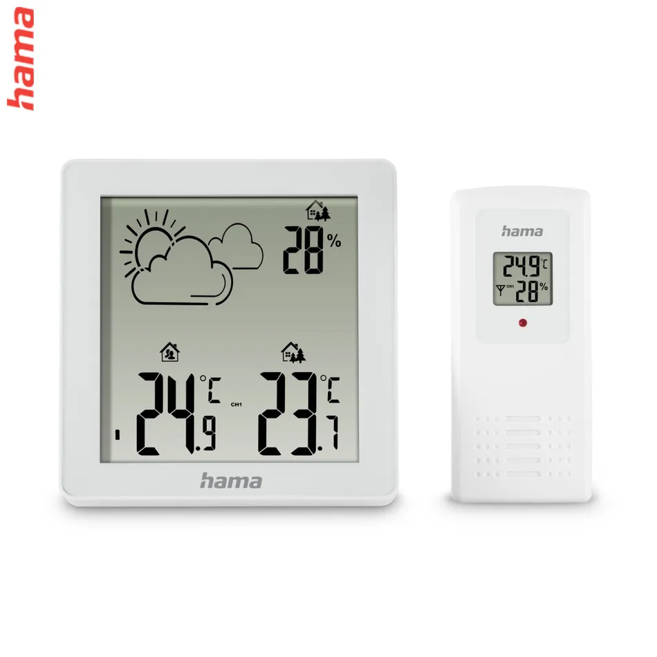 Hama Zakynthos je praktická dvojdielna meteostanica s jednoduchým ovládaním a moderným bielym dizajnom. Bezdrôtový senzor umožňuje merať teplotu a vlhkosť vo vnútri aj vonku až do vzdialenosti 50 metrov. Prehľadné symboly na displeji zobrazujú aktuálnu predpoveď počasia.